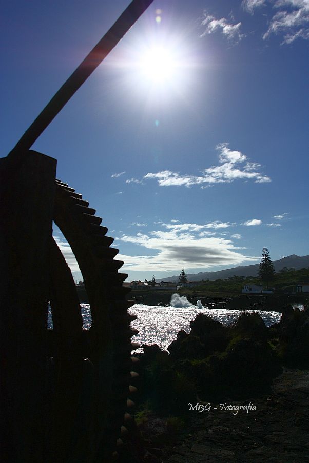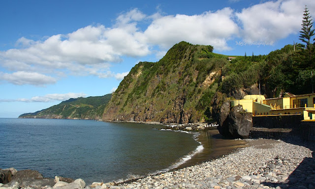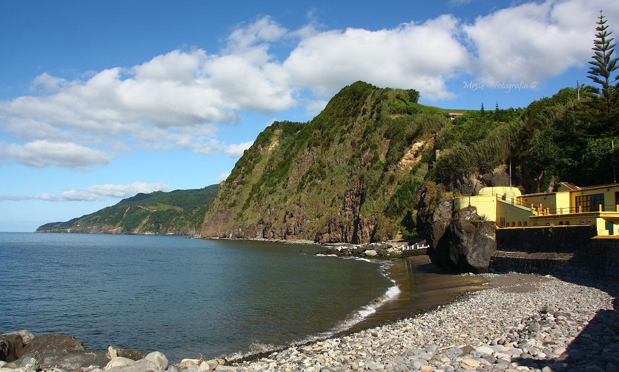As rochas vulcânicas, de cor escura, formam uma aprazível piscina circular de águas calmas e cristalinas, contrastando o negro basáltico das rochas com o profundo azul do Oceano Atlântico.